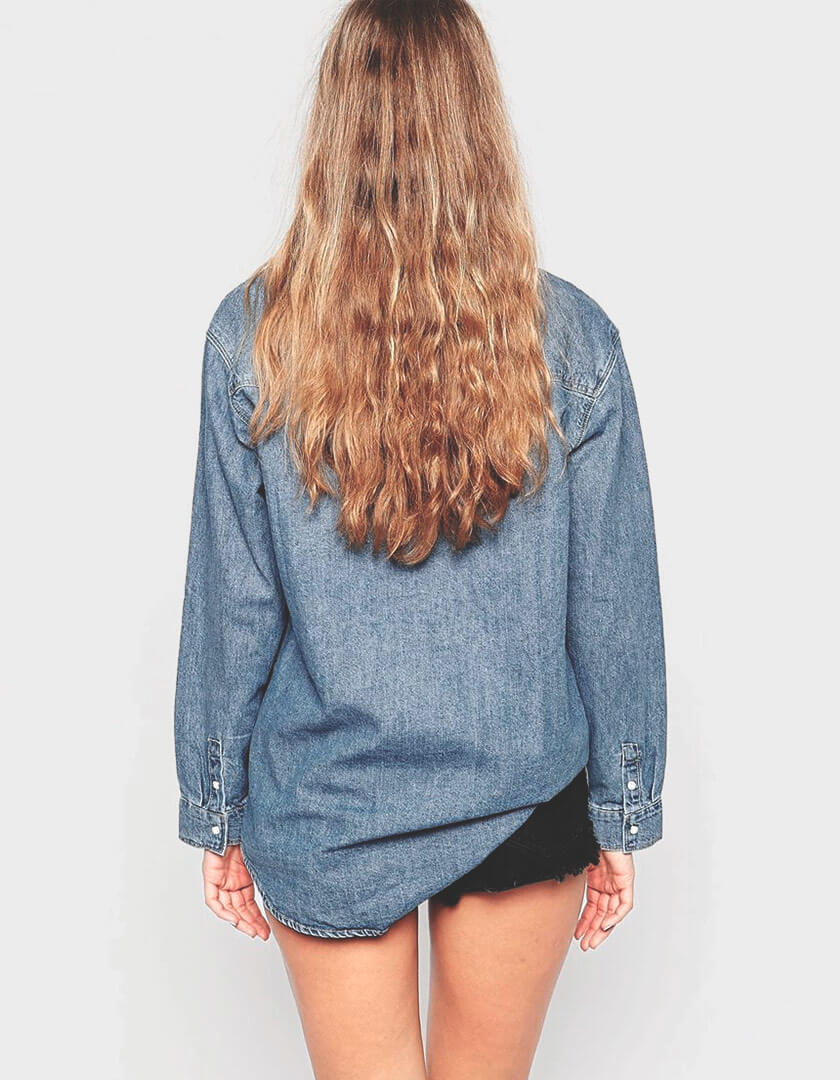 Blue chambray workwear shirt with a loose and longer boyfriend fit. The lightweight denim shirt is tailored for women and features two chest pockets. Finished with a brand tab on the pocket, curved hemline and adjustable buttoned cuffs.