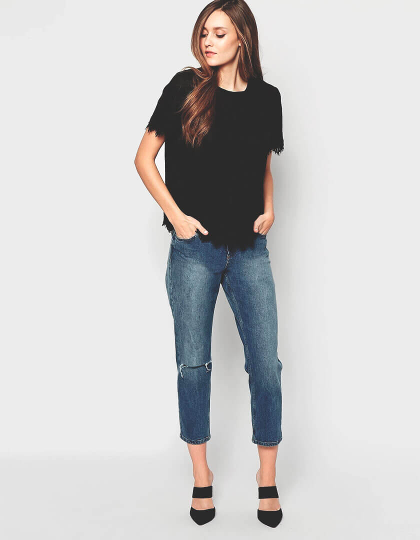 Comfortable and lightweight, this intuitive tee is ideal for summer. Constructed from a lycra and cotton mix, the loose hem design is breathable too. Lace details make it more feminine. Pair with denim in your favoured cut – this piece is hugely versatile.